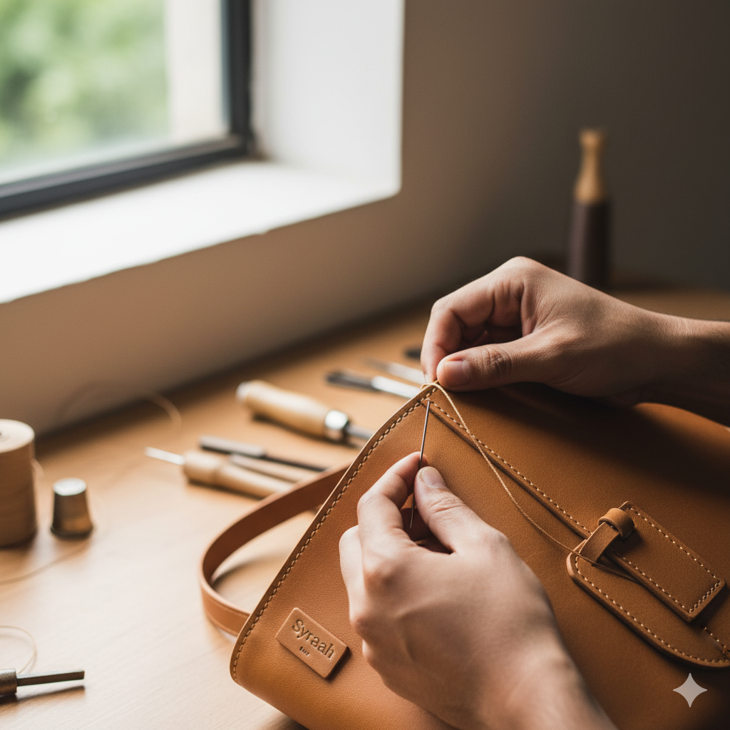Syraah represents this change: each bag is handmade in small batches by skilled Indian artisans using ethically sourced leather and eco-conscious methods.