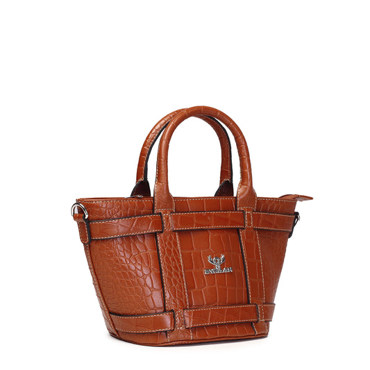 Syraah Tan Croco-Print Premium Full-Grain Leather Tote Bag